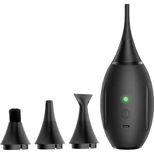 Easily clean your lenses and cameras with this black Electric Air Blower from LENSGO. Optimized for photography equipment, the rechargeable blower can also be easily switched to serve as a vacuum to pick up small dust particles. It includes four different nozzles for different cleaning applications, including a more precise sensor model, a regular head, a crevice head, and a cleaning brush.